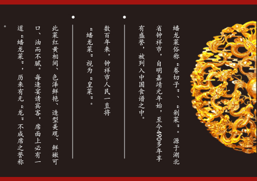 嚴選優質原料,歷史名菜,傳遞正宗鐘祥蟠龍菜!